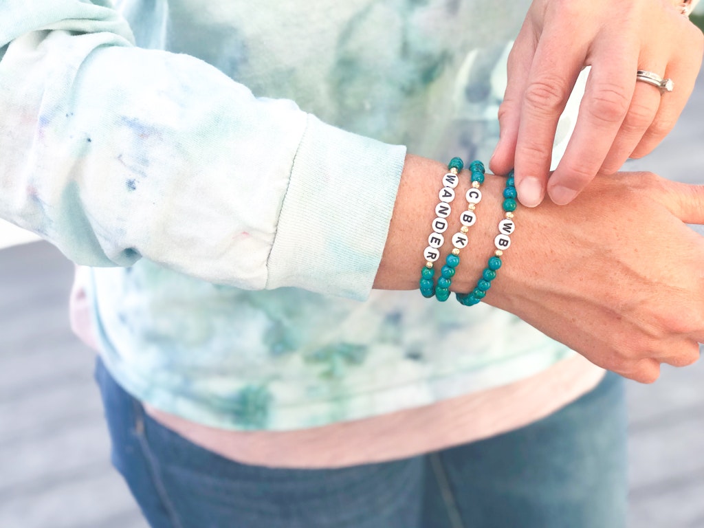 We made a few different ones to stack together. The supplies we used for this specific personalized letter bracelet are listed below, but we suggest getting a few different sizes, color options to mix, max and get creative.