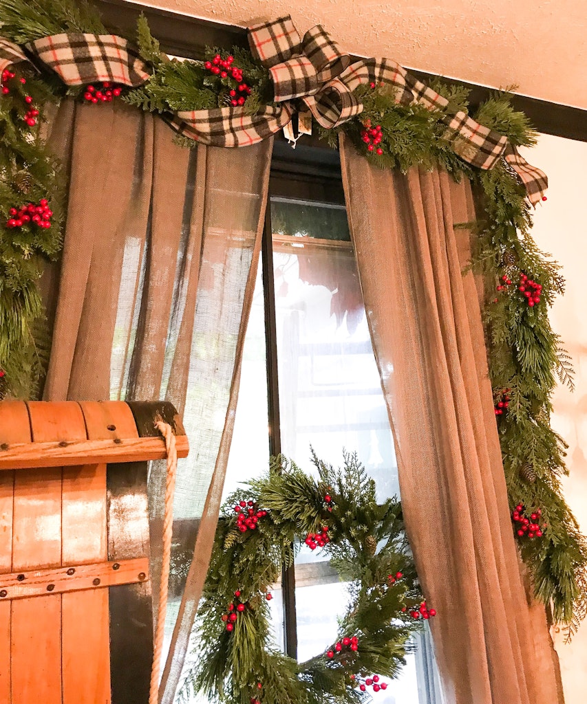 I think we are going to have to try something similar to these garland and bow valances.  Love the red berries with the plaid ribbon.