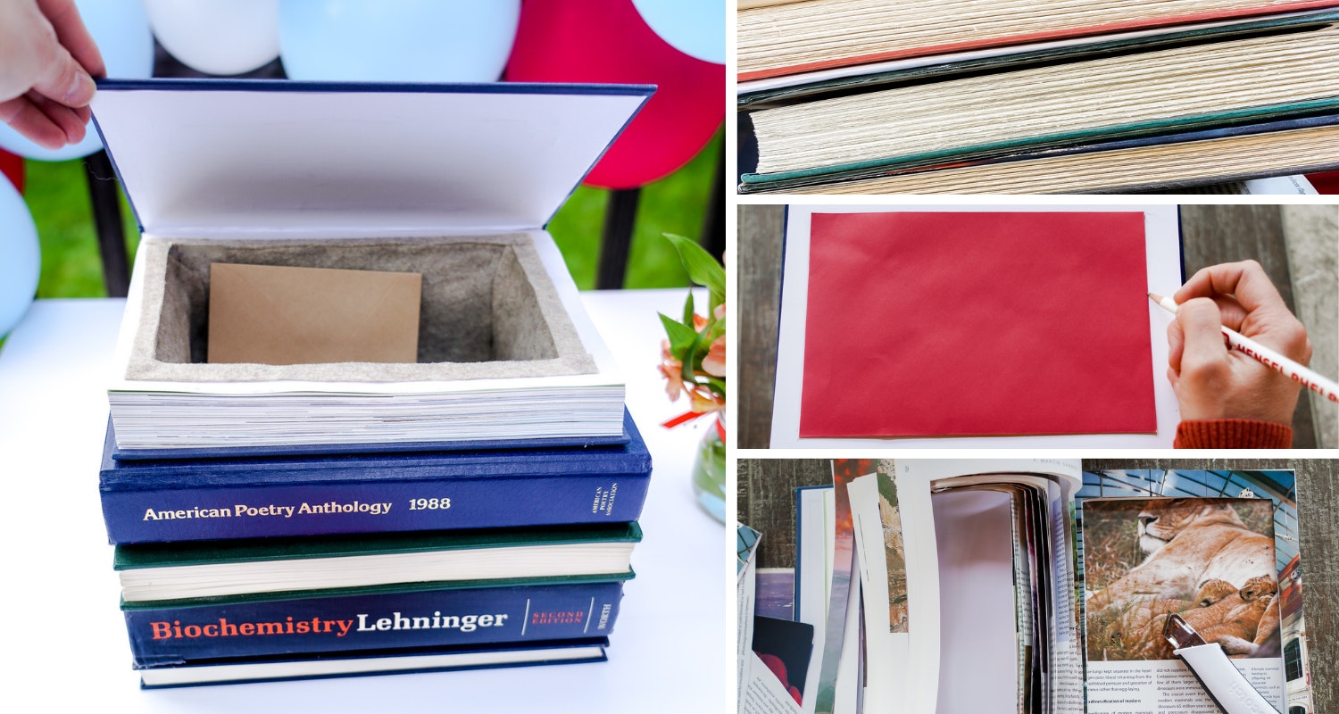 Have you ever seen a hardcover book with a secret compartment? I took it a step farther to hollow out several stacked books and create a graduation card box for an upcoming graduation party.