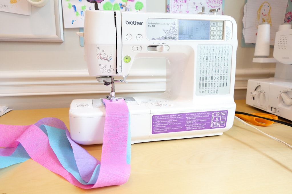 To easily have the sewing machine ruffle the streamers for you, you will turn up your machine’s tension to the highest or second to highest setting and increase your stitch length to the longest setting .