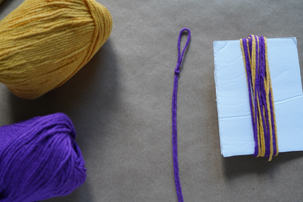 Cut a piece of yarn double the length of your cardboard plus a few inches. Fold the yarn in half and tie a knot in the middle to create a little loop.