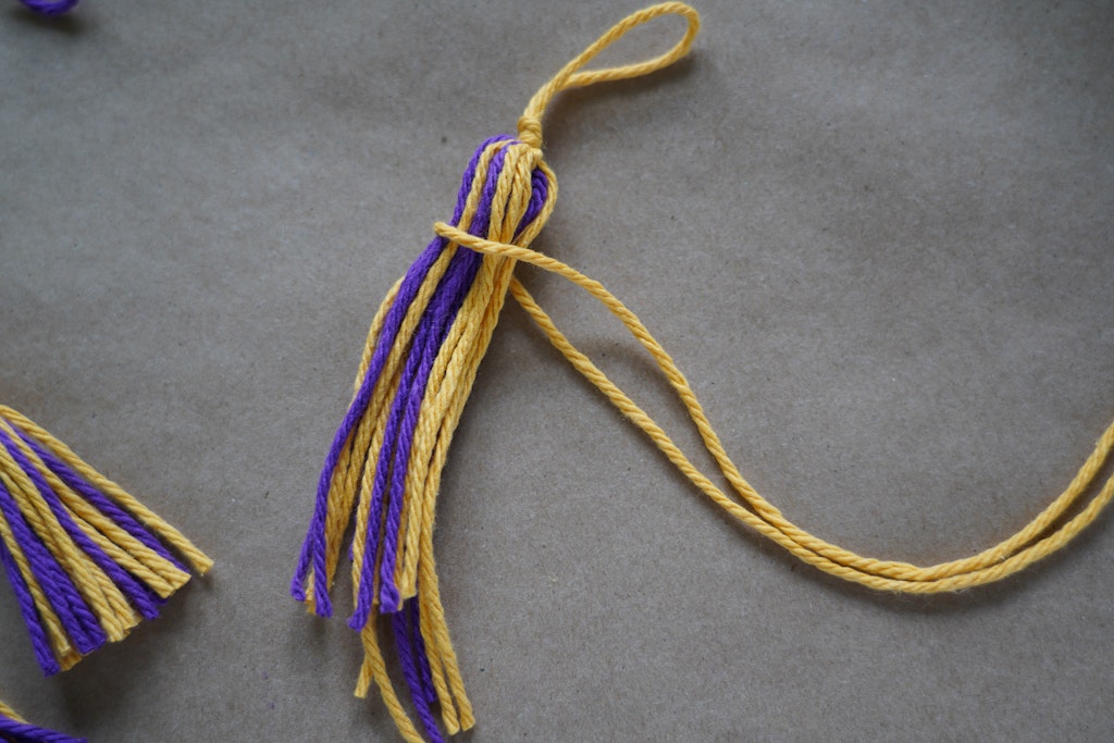Cut another piece of yarn about a few inches longer than double your tassel. Wrap it around the tassel leaving a small section in between the top knot and where you’re tying.