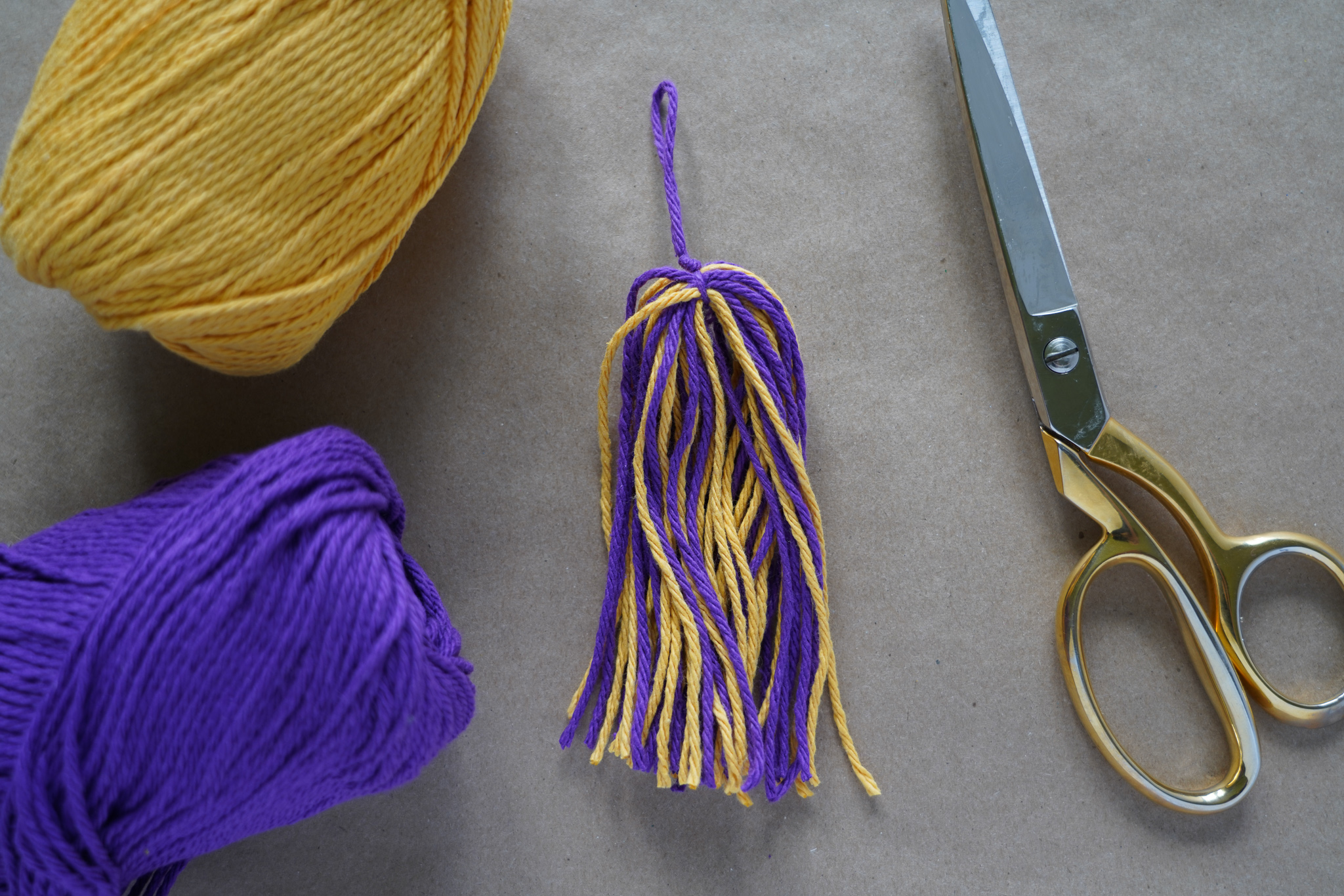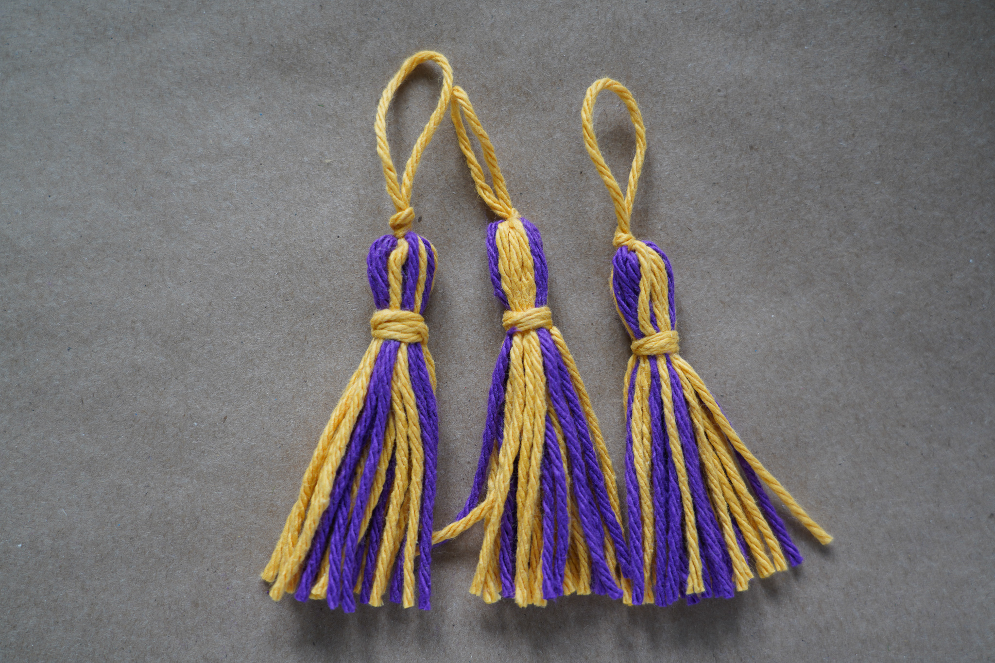 I found this cotton yarn at Walmart. You could also use embroidery floss, but that would be a little more expensive to get the same size tassel. You can use one single color on all the tassels or make some one solid color and others the other solid color or mix the two colors within the same tassel like I did.