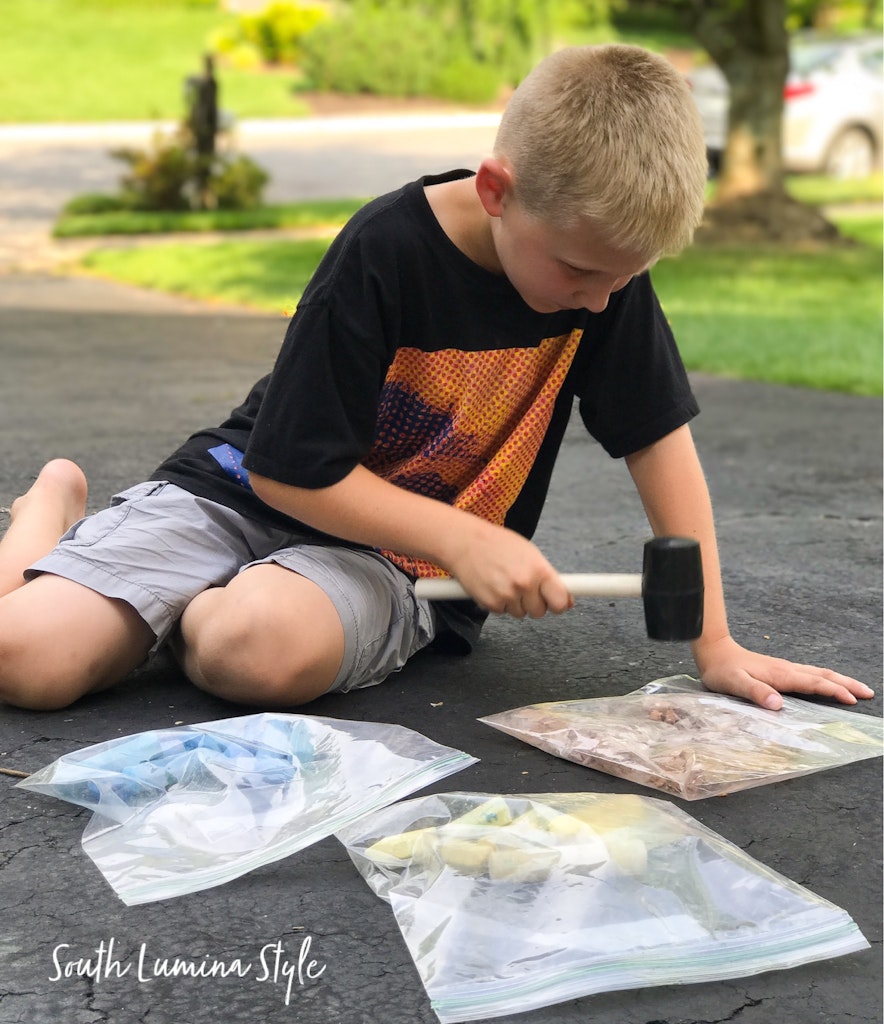 Lay out one of the sealed ziplock bags and use the rubber mallet to start smashing up the pieces of chalk inside.