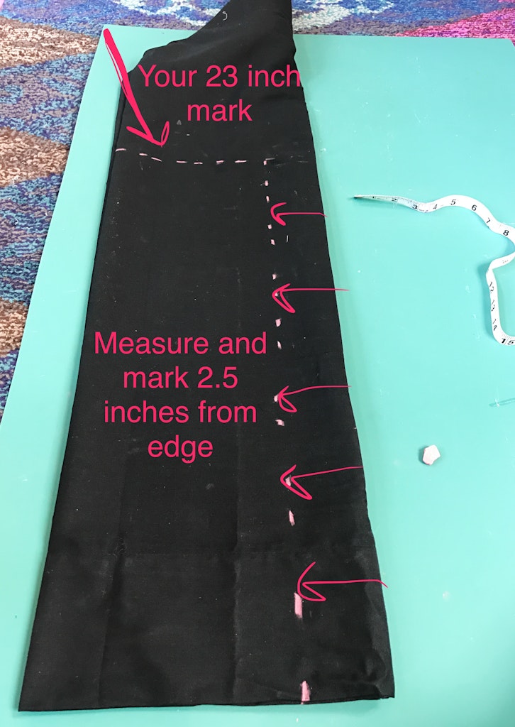 Measure 2.5 inches from the center fold all the way down to your 23 inch line.