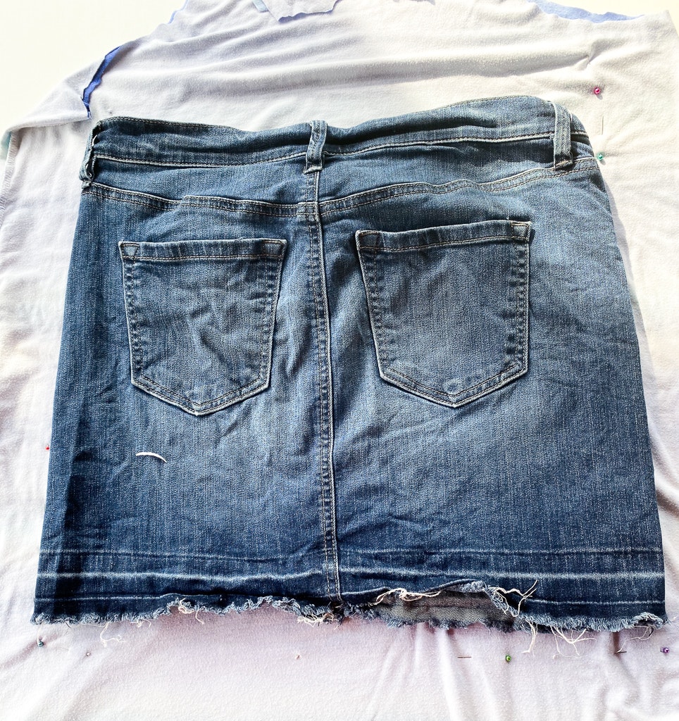Again this is a little overkill, but it’s so much easier to trim away excess material than to try to piece something back together once you’ve cut it too much. Cut out your skirt pattern. Next, add your side seams either with your sewing machine or fabric glue. Try on your skirt and mark where you would like to cut your curves for the skirt portion.