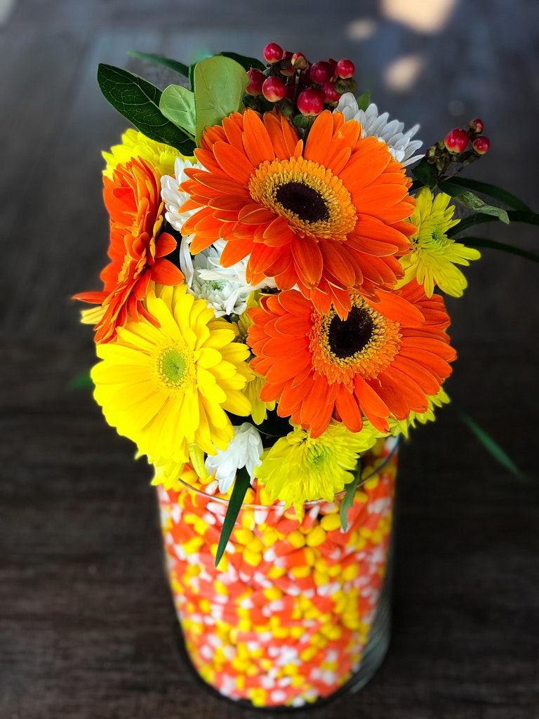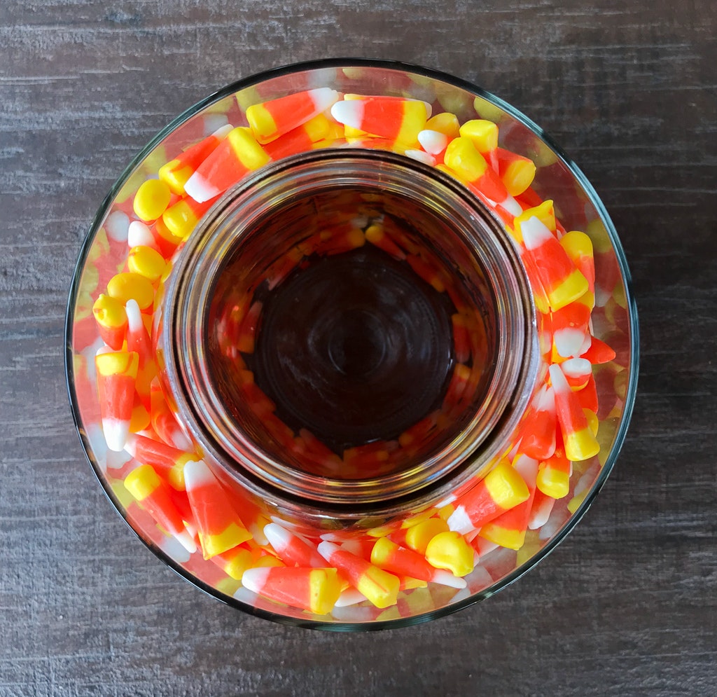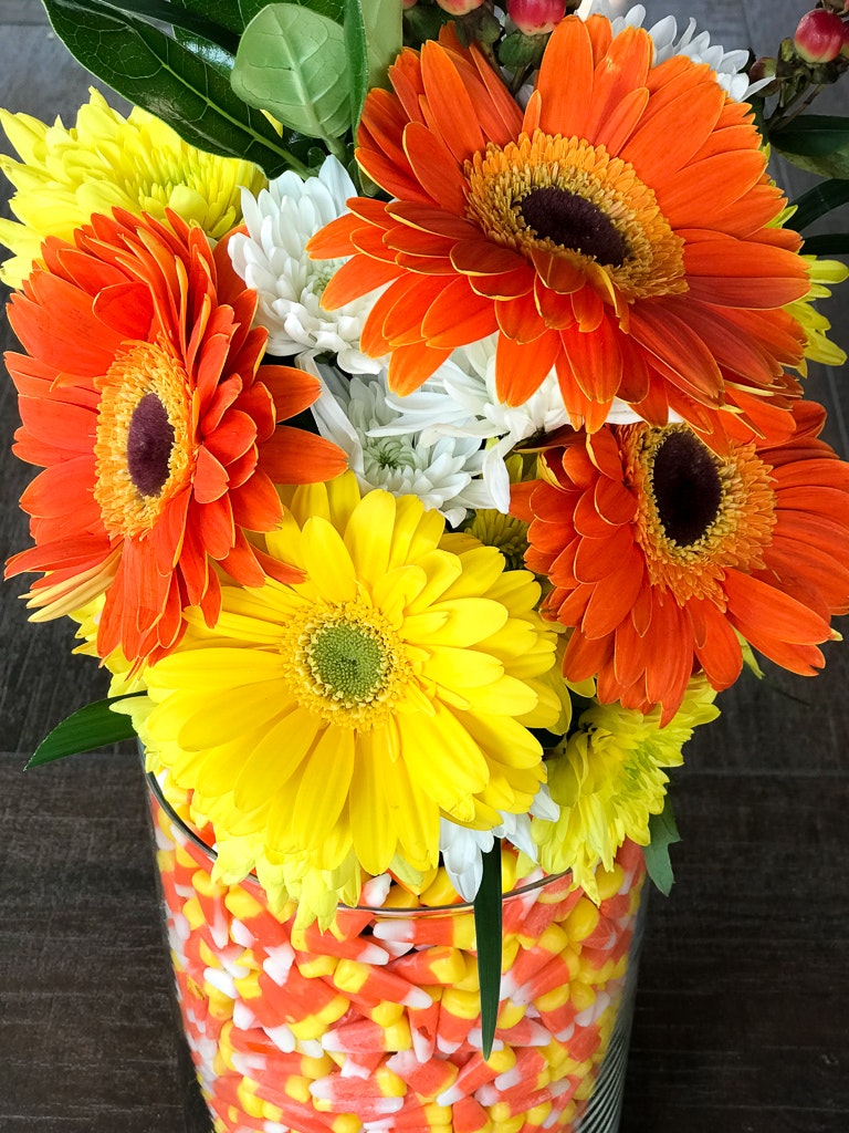 - Candy Corn – The amount of candy corn you purchase really depends on the sizes of your vase. We used about 4 bags of candy corn.