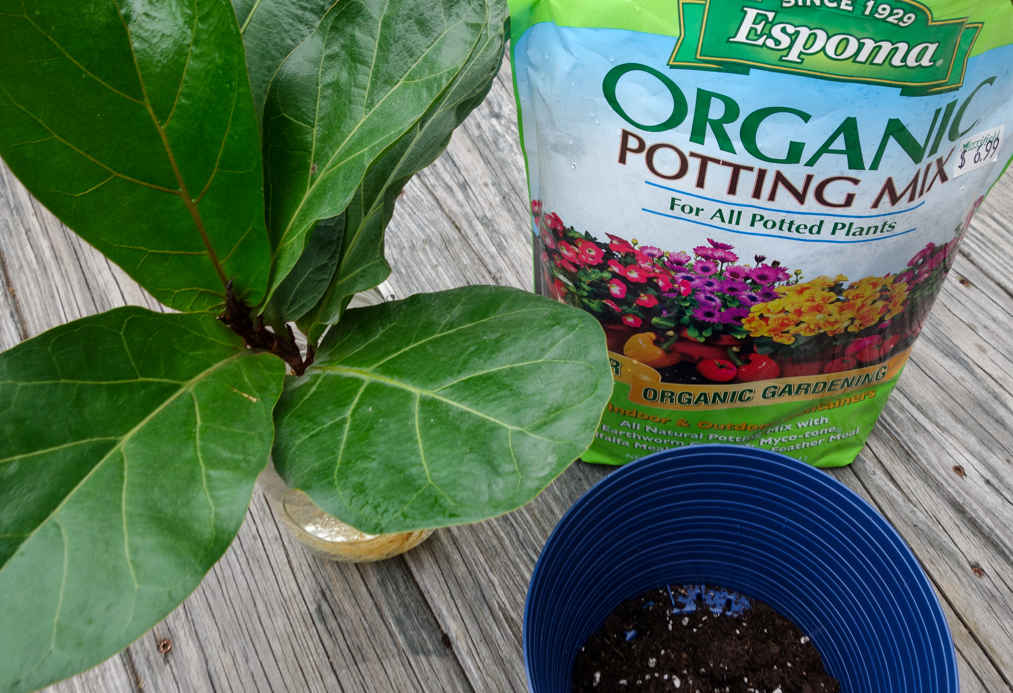Fill the bottom of your pot with a couple inches of soil. Place your new fiddle leaf plant roots in the soil and fill the rest of the pot up with your soil.