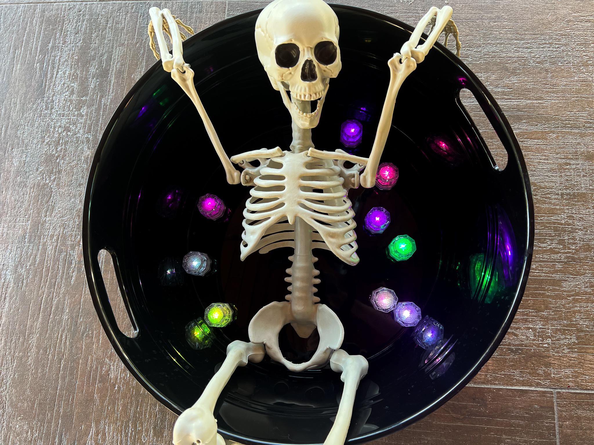 Place your skeleton down in your drink tub. Turn on your lights and place a few in the bottom before you add the ice.