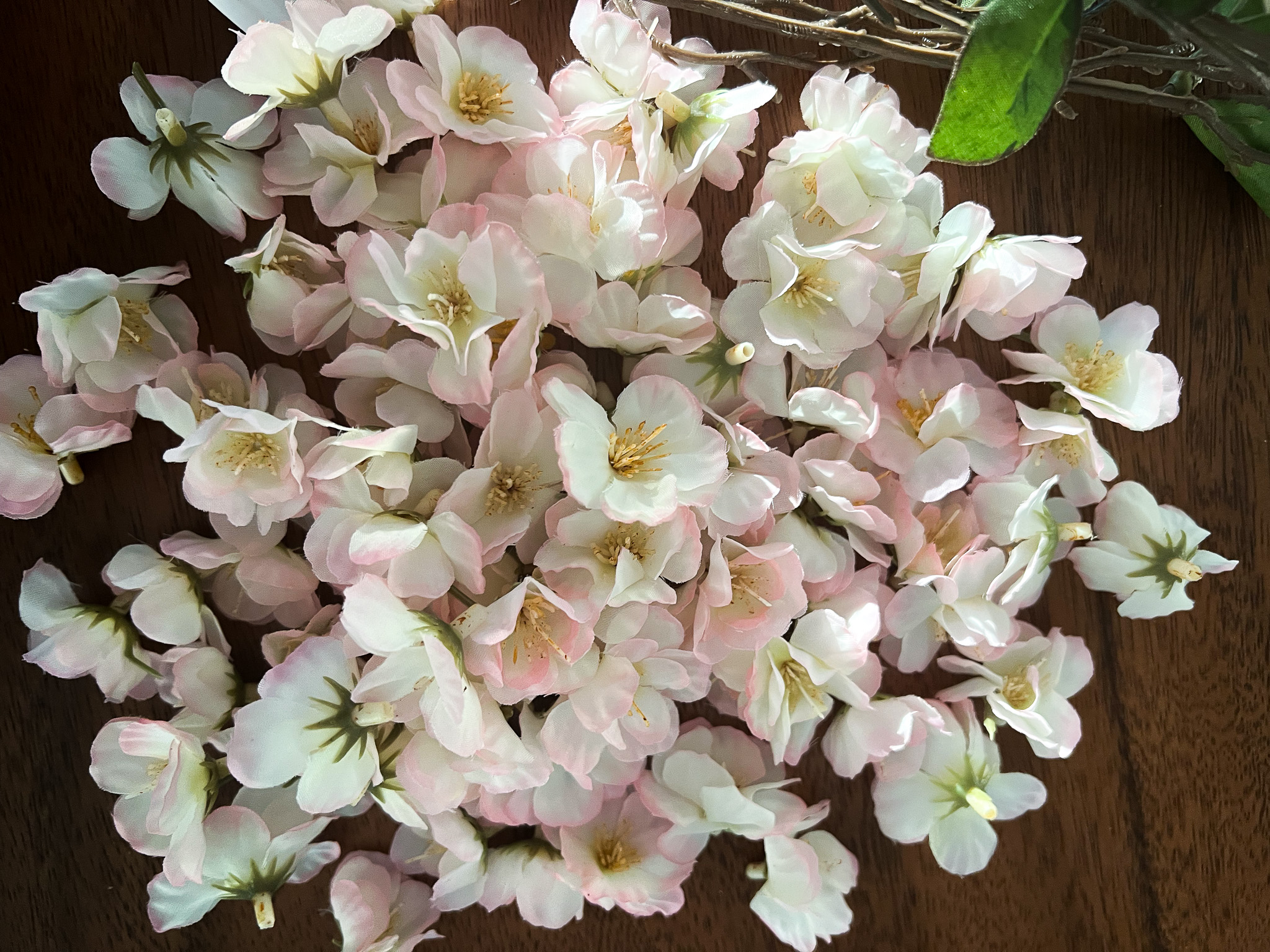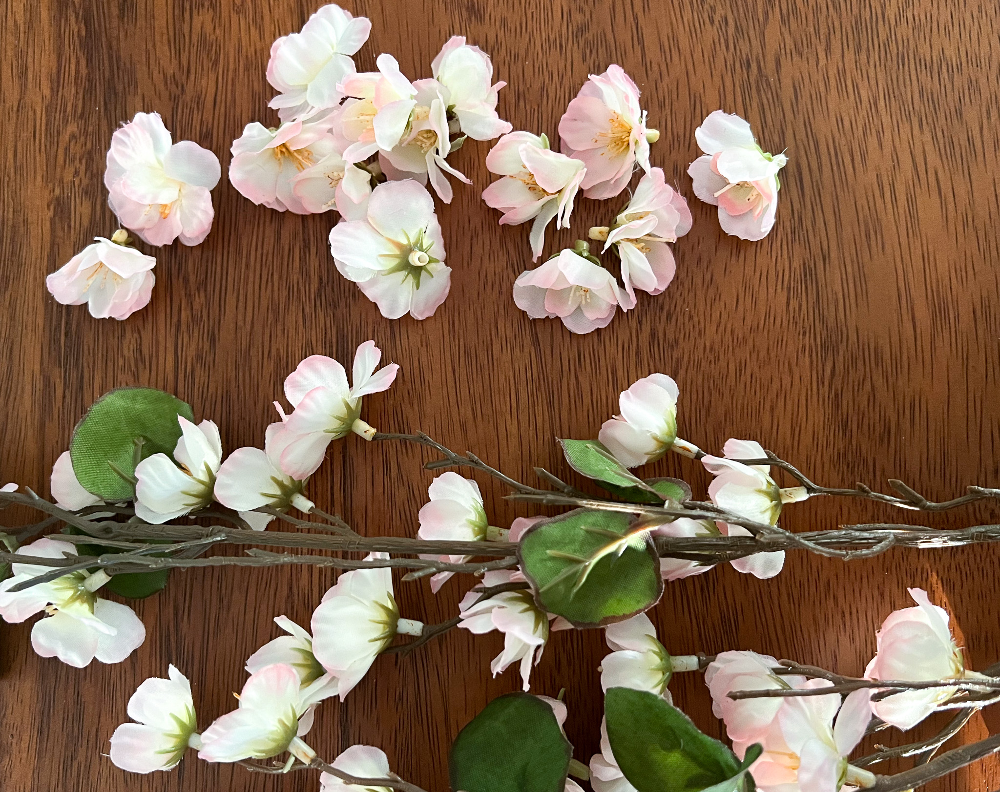 Second winter is coming, but you are ready for Spring. We have a super easy way to upgrade these faux Spring branches for your Spring decor. I picked up this bunch of faux flowers, but really want them to look more realistic. The blooms could pass as real from a distance, but the plasticky branches are a dead giveaway.