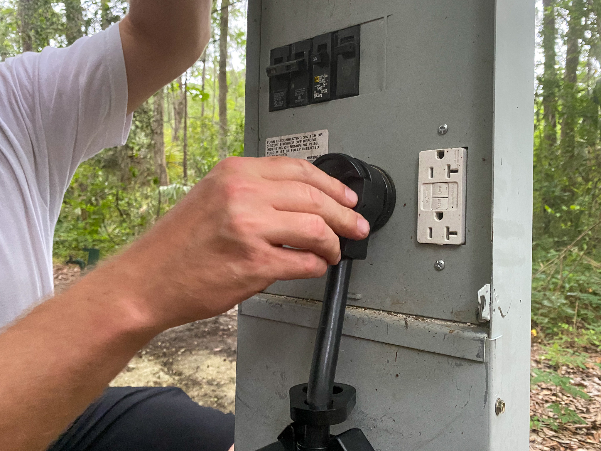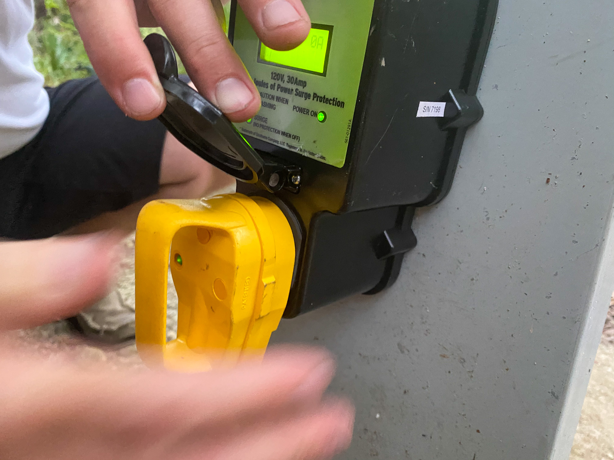Time to connect to electricity. Know what voltage your RV requires. Most of them are either 30 or 50 amps. Make sure that all of the switches are off. We highly suggest using a power surge guard. Locate with plug fits your RV’s amps and plug in your surge protector. Turn site’s power switch on for your voltage. Plug your RV’s power cord into the surge guard. Finally connect the power cord into your RV.